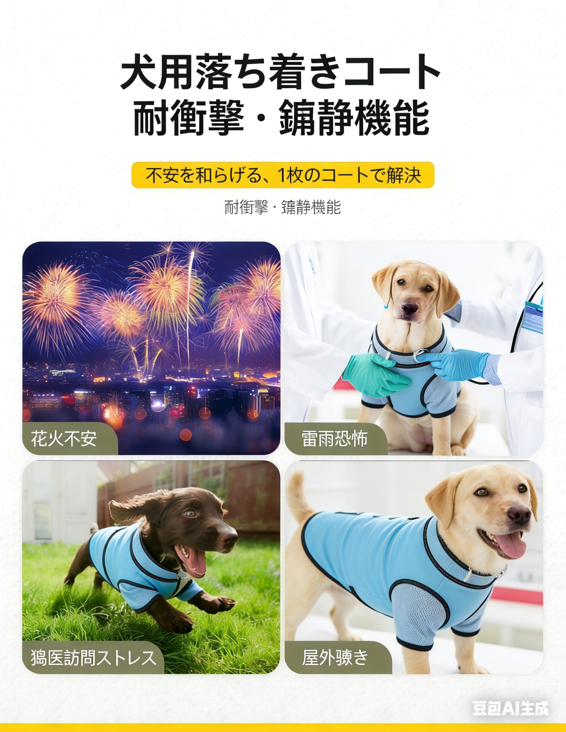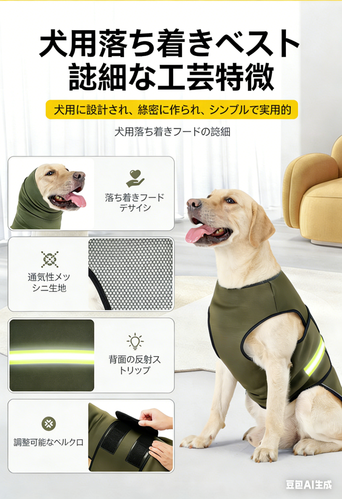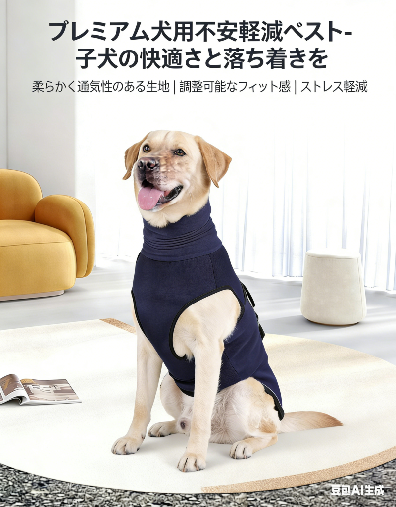 愛犬の不安やストレスを優しく包み込む犬用安定ベスト。雷・花火・留守番時の恐怖や緊張を緩和し、愛犬を穏やかな状態に導きます。通気性の良いメッシュ素材で長時間着用も快適、調節可能なベルクロでどんな体型にもフィット。夜間のお散歩に安心な反射テープ付き。