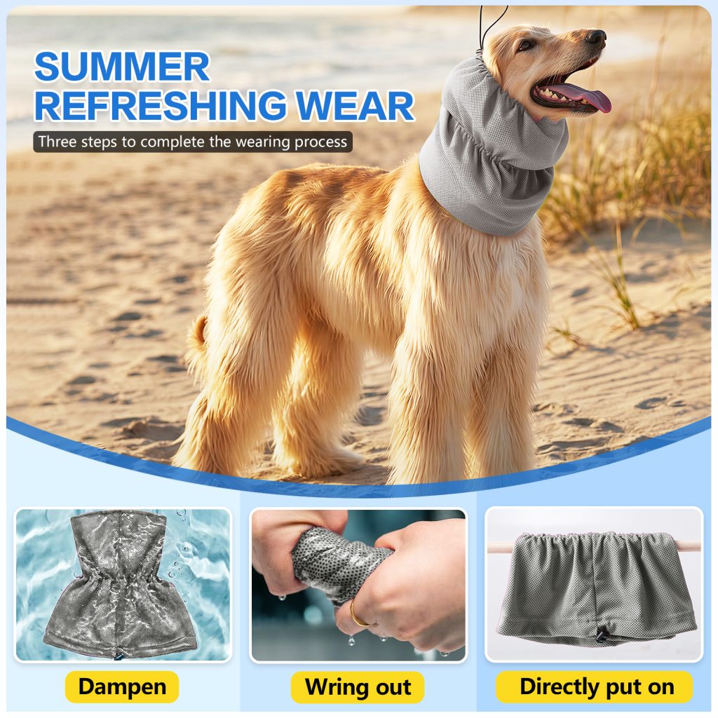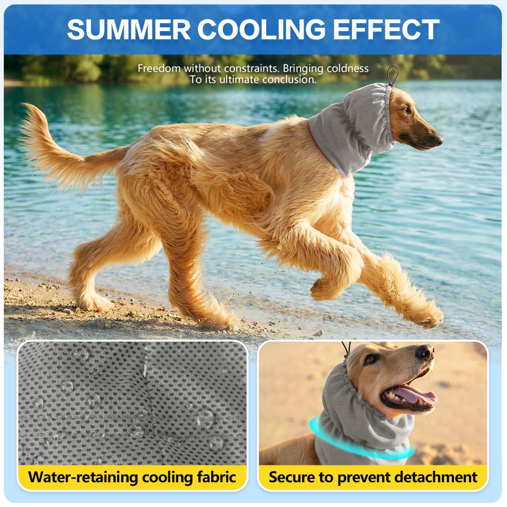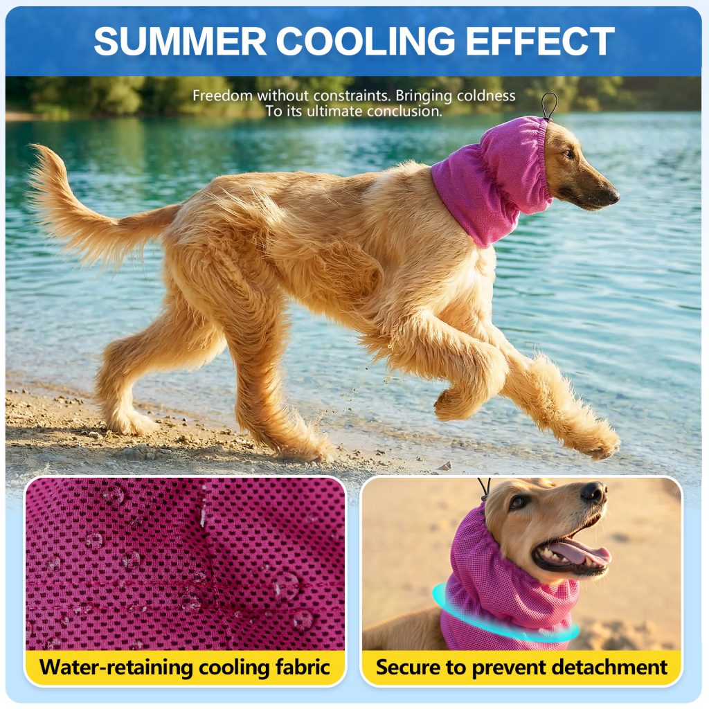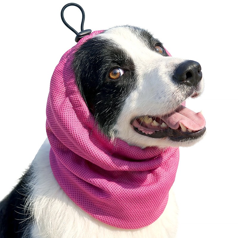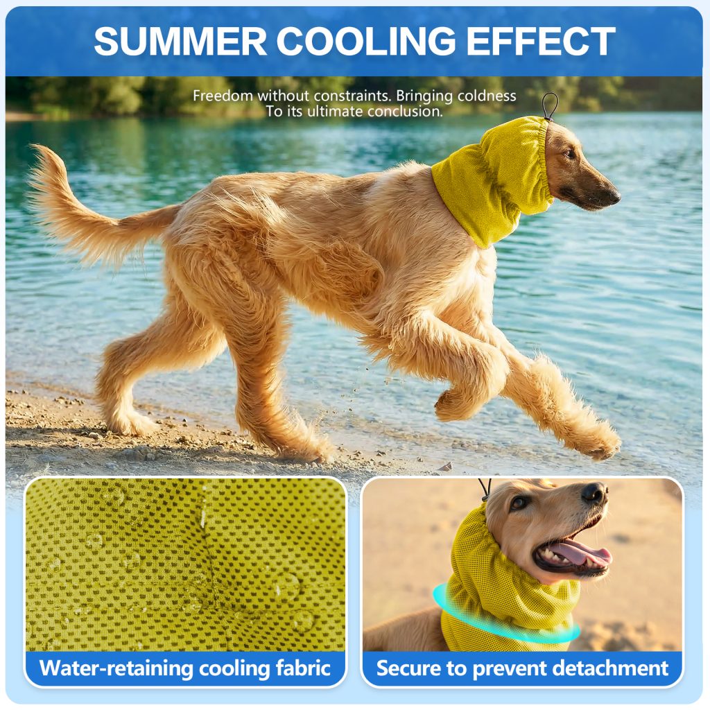 Adjustable cooling headgear for long-haired dogs, designed for summer heat relief. Soft cooling fabric keeps pets comfortable and refreshed during outdoor activities.