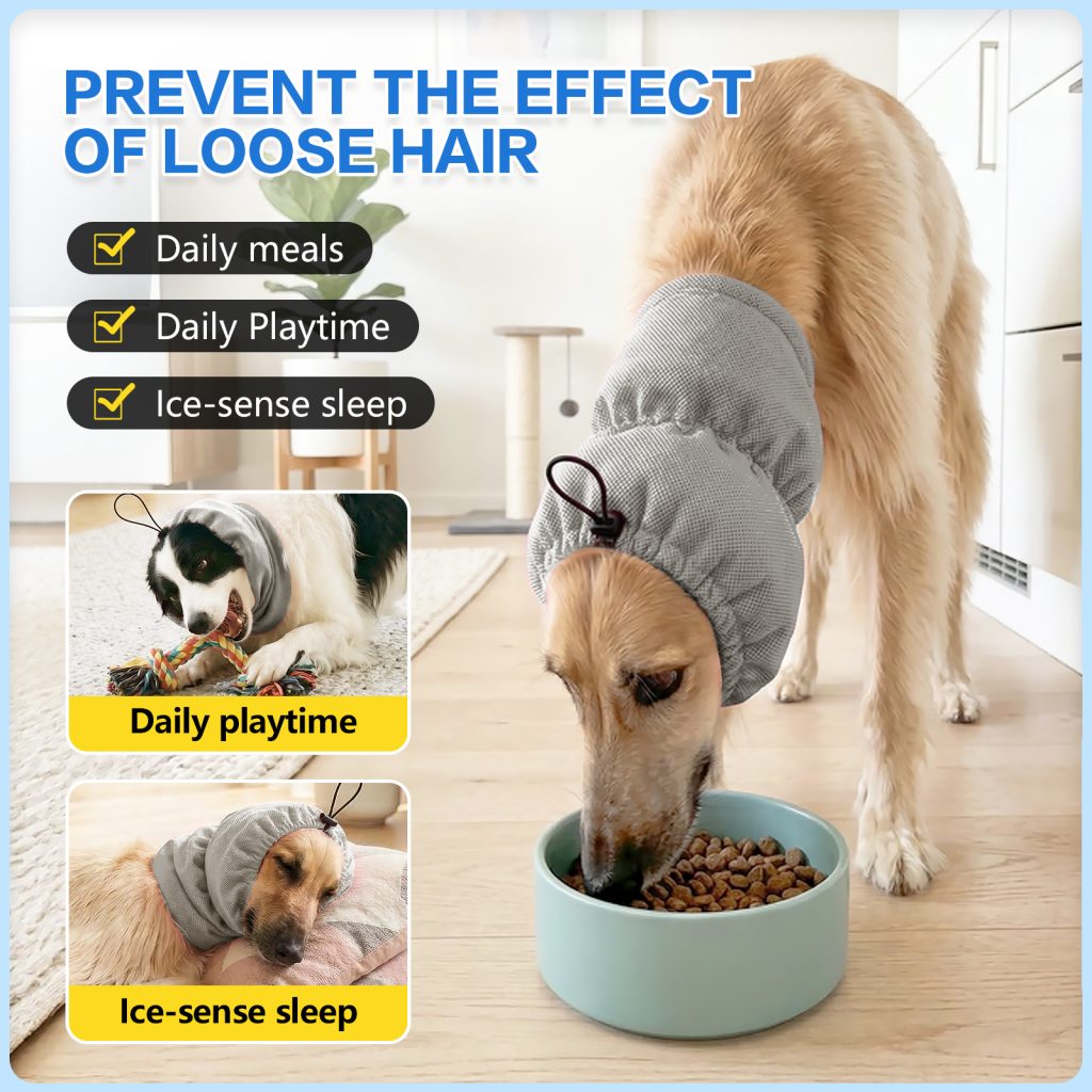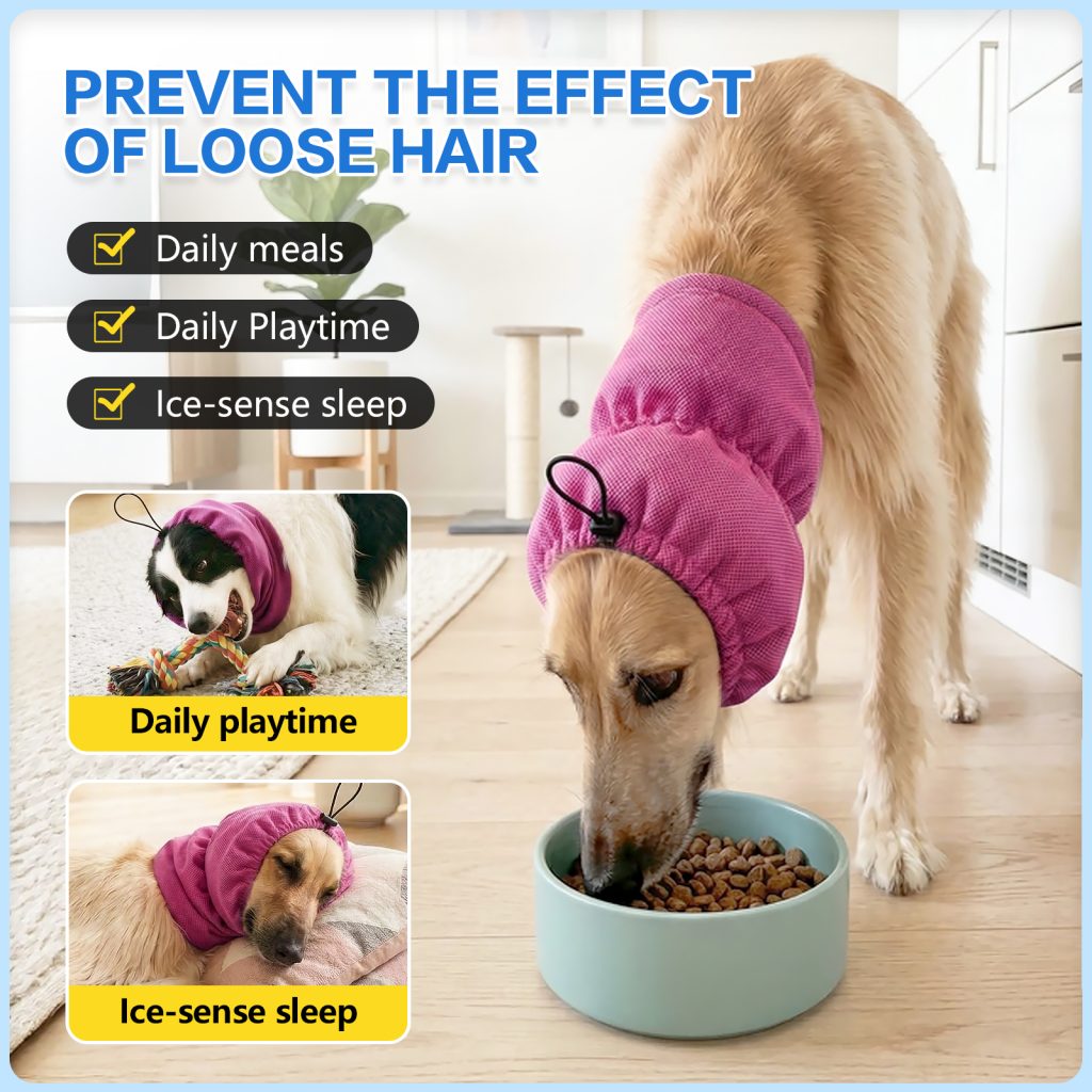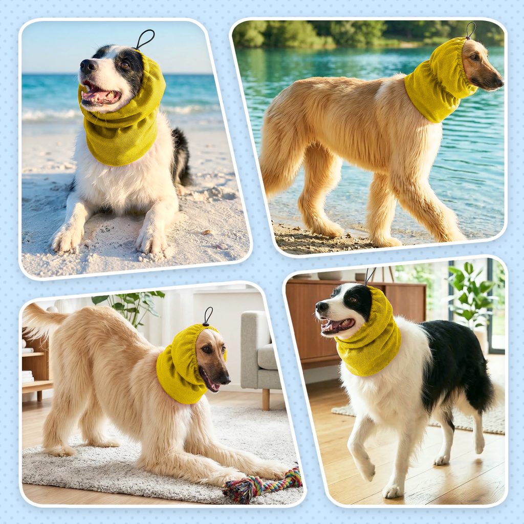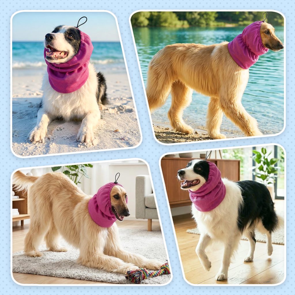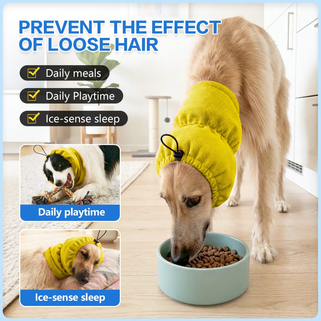 Adjustable cooling headgear for long-haired dogs, designed for summer heat relief. Soft cooling fabric keeps pets comfortable and refreshed during outdoor activities.